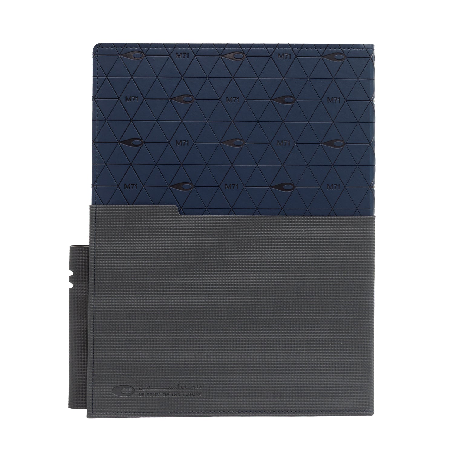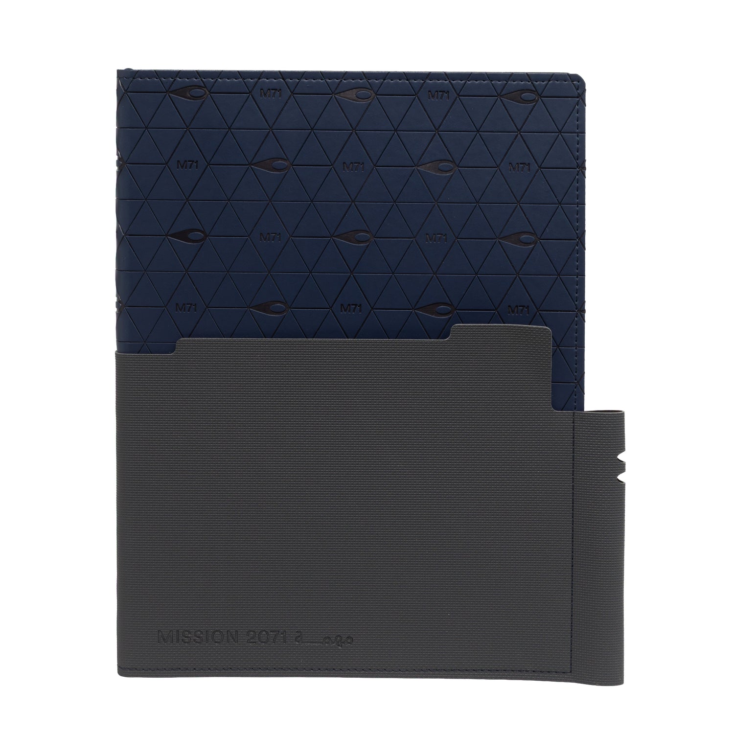 The M71 Technical notebook is a study in modern sophistication, merging architectural precision with high-performance utility. Its deep navy façade is defined by a tactile, embossed triangular lattice and subtle orbital motifs, neatly encased in a charcoal modular sleeve.